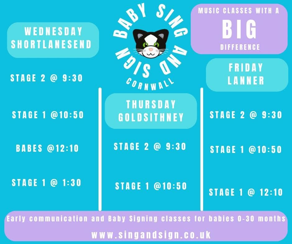 Classes will continue to be in Shortlanesend, Lanner Band Hall and Goldsithney. I’ll be running Stage 1 and Stage 2 classes in Lanner and Goldsithney and Stage 1, Stage 2 and Sing and Sign Babes classes in Shortlanesend.